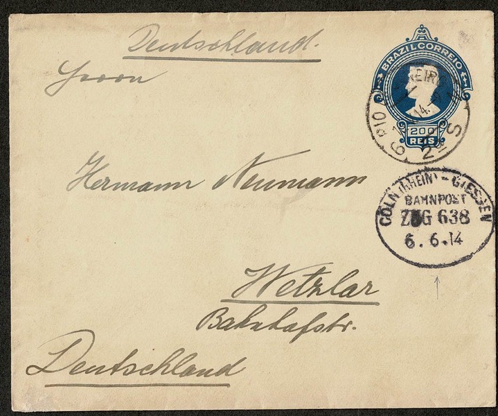 64 – 200Rs – Ano 1914 – Circulado do Rio de Janeiro para a Alemanha e carimbo frontal ferroviário, alemão, do trecho : Cöln – Giessen. Pouco comum de