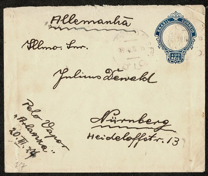 72 – 400Rs – Ano 192 ? – Circulado do Rio de Janeiro para a Alemanha. Peça com falta da aba de fechamento traseira – 140 UF = /- R$ 770..