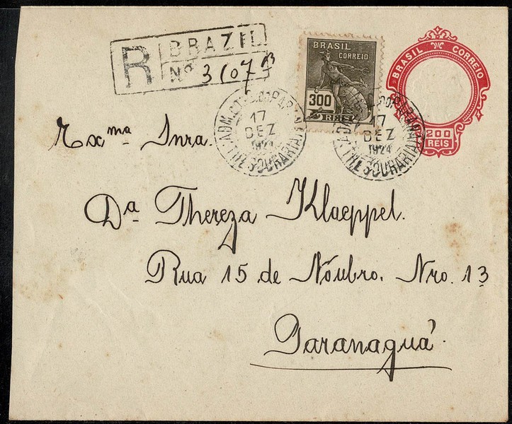 (75) 200Rs – Ano 1924 – Aba modelo II e tipo II (sem indicação no verso) mas em papel branco. Acompanha selo vóvó 300Rs, registrado, circulado de Curitiba para Paranaguá, com chegada. Pontos de ferrugem…