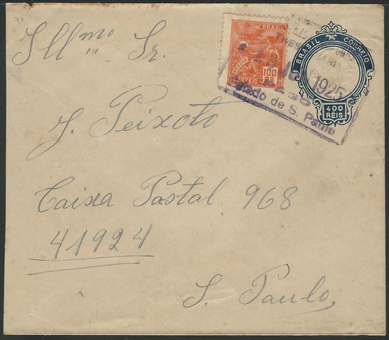 77 – Ano 1925 – 400Rs selo vovó 100Rs, registrado ? circulado provável dentro de São Paulo. Mínimo refilo – 700 UF = /- R$ 3.800..