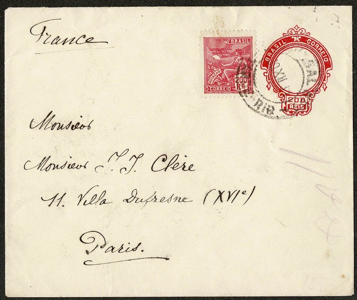 (78DE) – 200Rs – Ano 1931 – Variedade não catalogada : Decalque interno – Circulada do Rio de Janeiro selo vovó, para Paris..