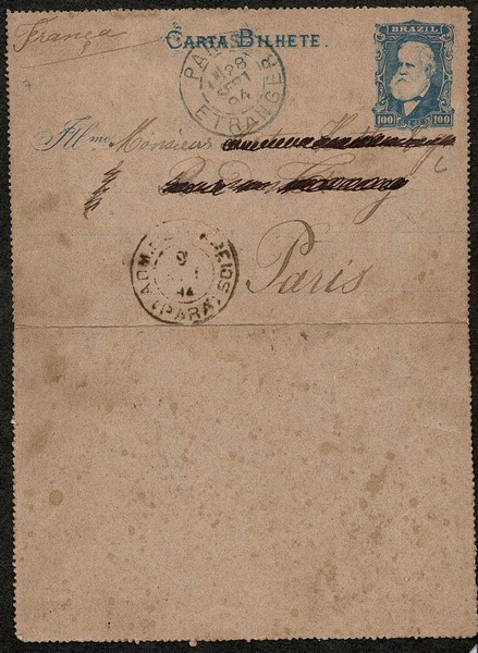 7 – 100Rs – Ano 1894 – Circulado do Pará para Paris, com chegada. Destinatário riscado à pena – 180 UF = /- R$ 1.000