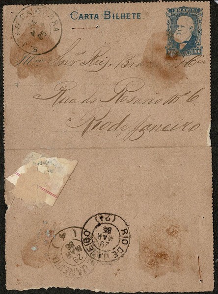 7 – 100Rs – Ano 1885 – Circulado de S.João da Barra (RJ) para o Rio de Janeiro, com chegada. Peça com duplo furo de grampo, 2 manchas frontais, aderência de papel e senão no picote. Pede-se verificar – 180 UF = /- R$ 1.000
