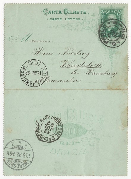 13 – Ano 1892 – 200Rs – Circulado de São Paulo para a Alemanha, com carimbos de trânsito chegada. Mancha lateral – 110 UF = /- R$ 600
