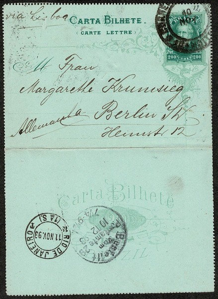 13 – Ano 1893 – 200Rs – Circulado de São Paulo para a Alemanha, com carimbo de trânsito no Rio de Janeiro chegada – 110 UF = /- R$ 600.