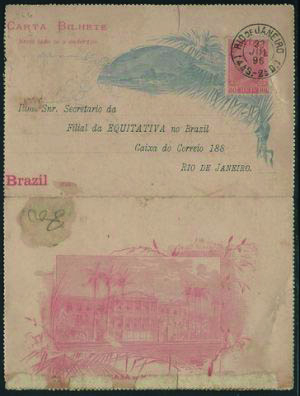 46G – 80Rs – Ano 1896 – Circulado dentro da cidade do Rio de Janeiro. Na parte de dentro, propaganda impressa da firma “Equitativa”. Peça com 3 cortes laterais e alguma aderência – 600 UF = /- R$ 3.300