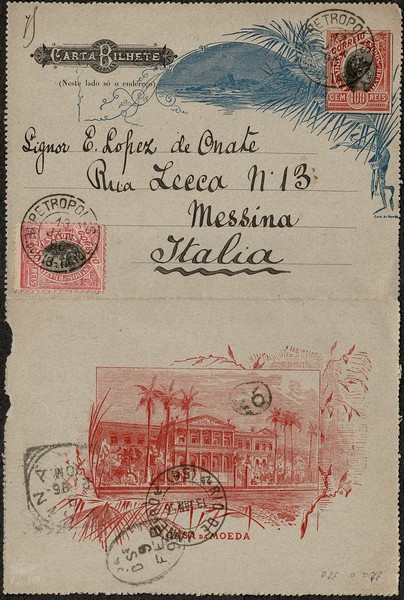 53e – 1896 – 100Rs selo madrugada 100Rs, circulado de Petrópolis para a Italia, com carimbo de trânsito chegada. Variedade: Deslocamento do selo fixo ou da moldura dele. Vistoso.