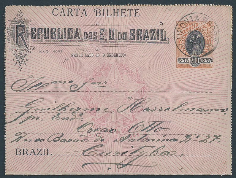 68J – Ano 1906 – 200Rs, circulado de Ponta Grossa para Curitiba, com chegada. Falha na lateral direita, na parte inferior – 3.500 UF ! (Cerca de R$ 19.200).