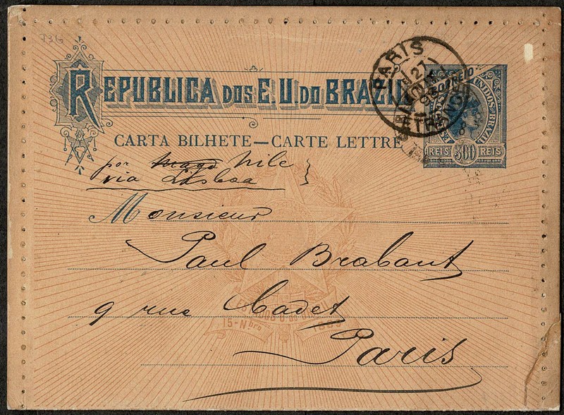 73G – 300Rs – Ano 1898 – Circulado do Rio de Janeiro para Paris com carimbo de chegada sobre o selo fixo (que não é usual) O catalogo RHM indica o mês 10/1898 como sua emissão, mas esta peça foi enviada em 10/AGOSTO, portanto pode-se alterar a data pelo menos para esta. Reparo na lateral direita…