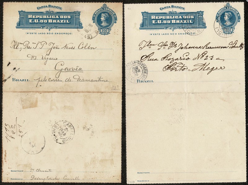 80 – Anos 1907 e 1908 – 2 peças circuladas: Santos para Porto Alegre, com chegada e Curvelo para Gouveia com trânsito em Camellinho – 180 UF /R$ 990.