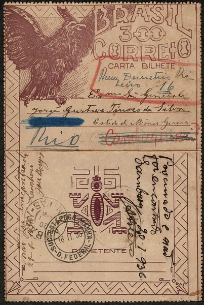 99 – 300Rs – Ano 1936 – Circulado de ? para Lambary (MG) e posterior para Cambuquira e por final devolvida ao Rio de Janeiro – 120 UF = /- R$ 660