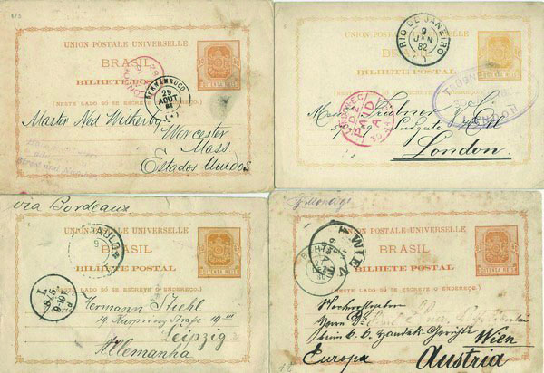 5 – 80Rs – Lote com 5 peças circuladas, todas ao exterior: Bahia/Austria e no ano de sua emissão (escasso) São Paulo/Alemanha, Rio de Janeiro/Londres, Rio de Janeiro/Alemanha, Pernambuco/Estados Unidos. Apenas 1 não tem chegada. Anos 1880 a 1882. Vide imagem completa na web. Nornal conservação para lotes – 600 UF = Cerca de R$ 3.300. Lote 0906 da nossa 70ª, agora oferecido com 20% de desconto.