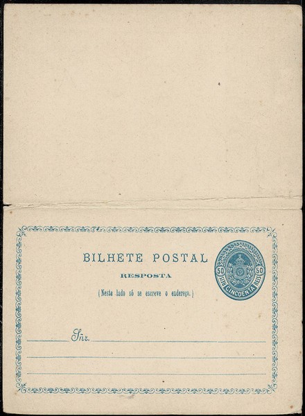 7/7a – 50Rs duplo, novo sem uso e surpreendente combinação : Cor azul escuro na parte da pergunta e cor azul claro na parte da resposta. Como isto pode ocorrer ? Nitidamente percebe-se a diferença. Peça um pouco irregular na junção das partes.