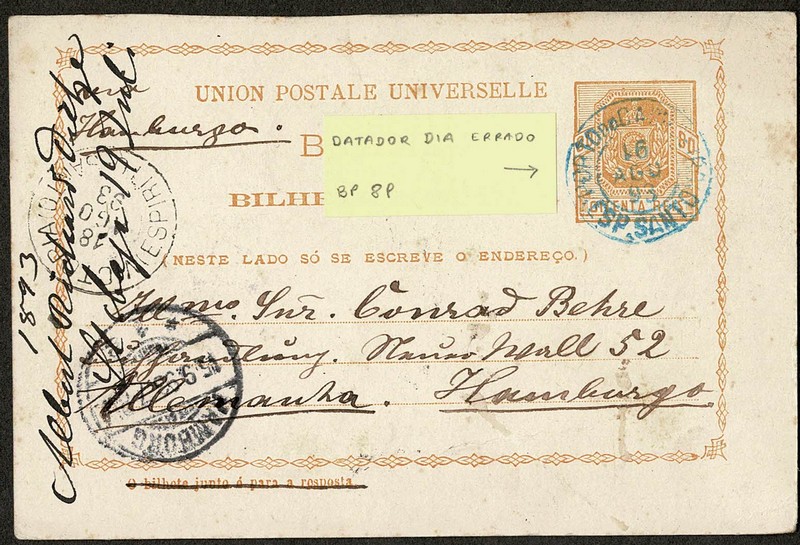 8P – 80Rs – Ano 1893 – Circulado de Porto do Cachoeiro (ES – carimbo azul) para a Alemanha, com trânsito em Vitoria Rio de Janeiro chegada. Datador do dia no carimbo de saida, errado: 91, em vez de 19. Discreta marca de dobra – 350 UF (Cerca de R$ 1.900).