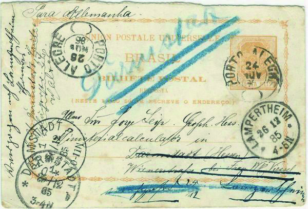 8R – Ano 1885 – 80Rs – Parte da resposta, usada como pergunta. Circulado de Porto Alegre para a Alemanha e lá com reencaminho à outra cidade. Trânsito no Rio de Janeiro chegada nas 2 cidades alemãs. 8 carimbos no total na peça indicação manuscrita alemã : Darmstadt