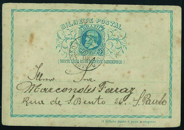 13P – Ano 1880 ? – 50Rs – Circulado aparentemente dentro da cidade de S.Paulo. O carimbo não está nítido, mas a data no texto diz “1880”. No catálogo RHM a data de emissão seria 1884 – Quem está correto ? Pontos de ferrugem – 600 UF….