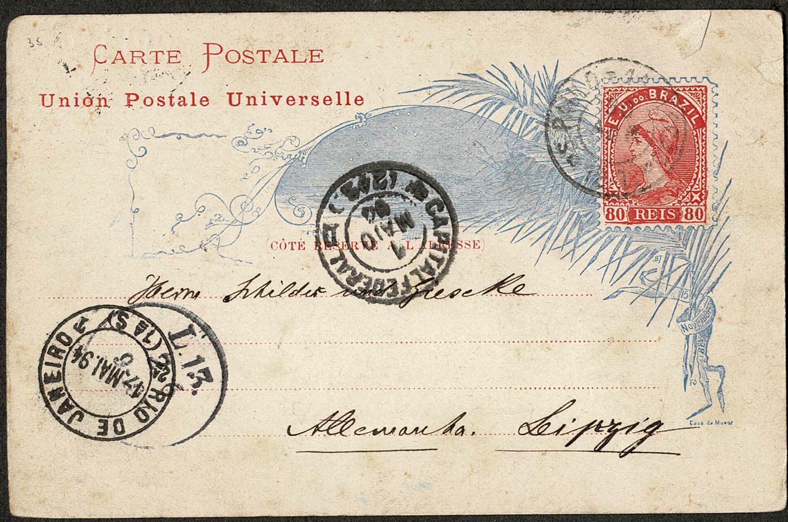 35 – Ano 1894 – 80Rs – Circulado de São Paulo para a Alemanha, com carimbos de transito chegada. No canto superior direito, as “partes” estão um pouco descoladas pontos de ferrugem – 240 UF = /- R$ 1.300