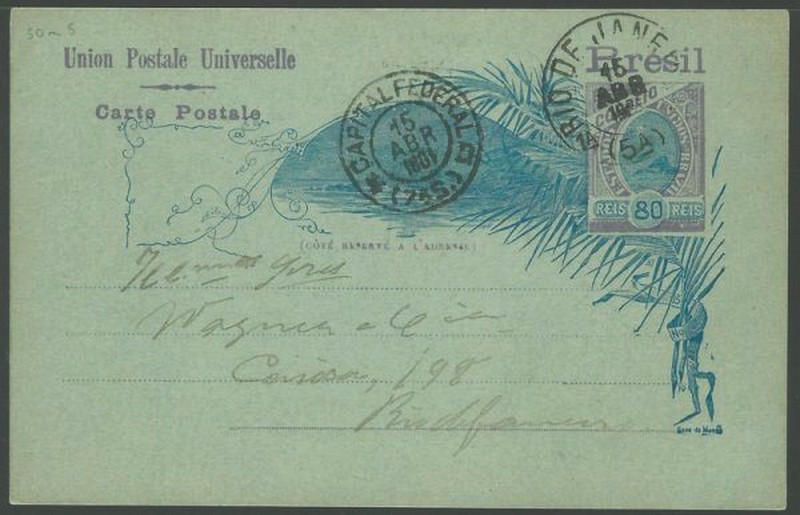 50m5 – 80Rs – Ano 1901 – Circulado dentro do Rio de Janeiro, com chegada. No verso, propaganda da Revista Philatélica do Brazil – Alph Bruck. Sem cotação para usado. No sem uso ele marca 480 UF = /- R$ 2.600.