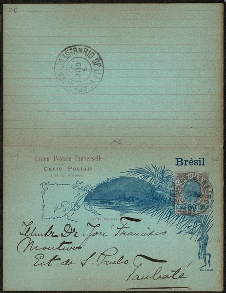 52E – Ano 1895 ? – 80Rs Duplo. Circulado do Rio de Janeiro para Taubaté. Só utilizado a parte da pergunta. Sem texto interno..