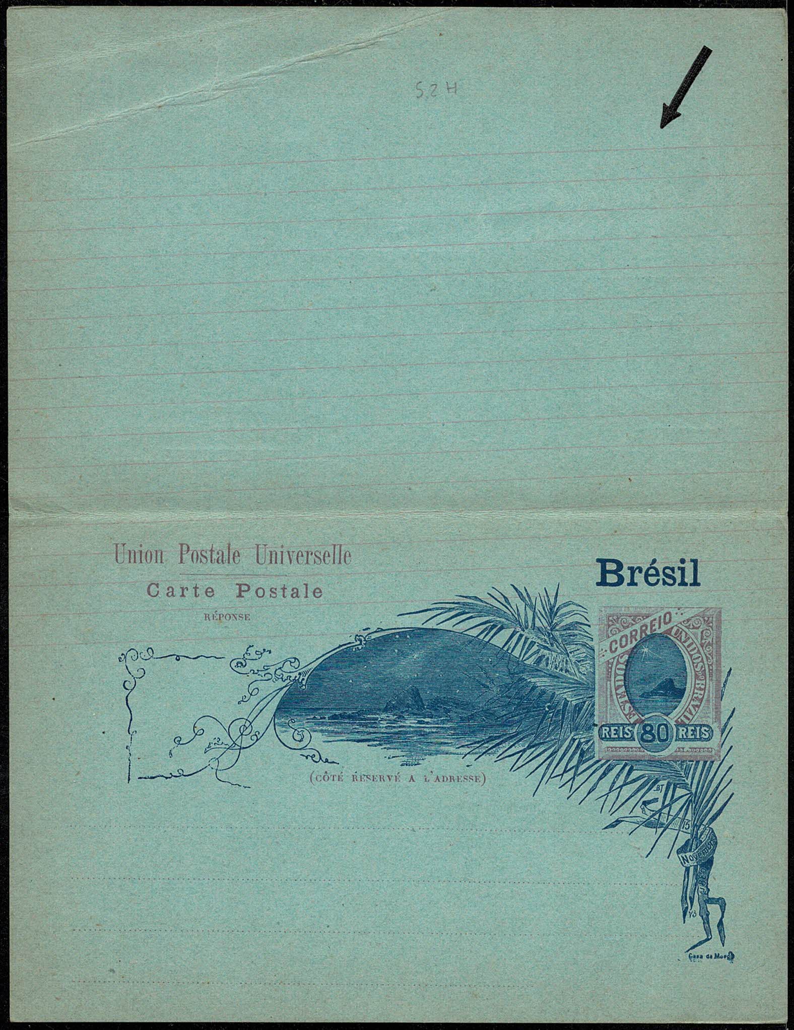 52H – 80Rs – Duplo, nova sem uso e variedade: Deslocamento vertical das linhas vermelhas, “invadindo” a parte do endereçamento na parte superior, na resposta. Vinco diagonal na parte da pergunta. Bem curioso e vistoso. Vide imagem.
