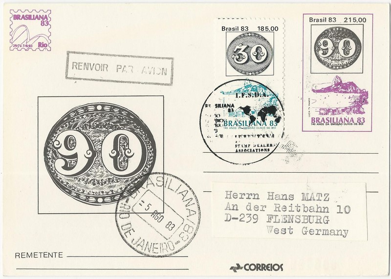 166 – Ano 1983 – Brasiliana 1983 – Circulado do Rio de Janeiro (do recinto da Exposição) com selo adcional de 185,00 da mesma série, para a Alemanha. Correto porte de 400,00 ? Qualidade européia.