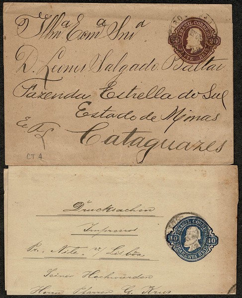 2ª série – 2 peças circuladas: nº 4 – 20Rs – circulado do Rio de Janeiro para Cataguazes nº 5 – 40Rs – circulado de Santos para a Alemanha, com possíveis selos complementares caídos. Anos ilegíveis.