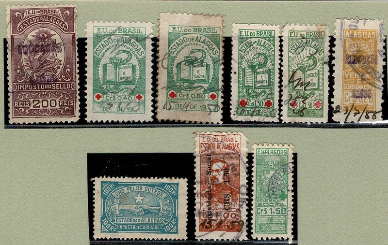 Alagoas – ◉ Educação e Saúde – FC 1, 3, 4, 5 ( algarismo grosso e fino) e 6 Caridade FC 1 (gomado) e assistência social – Anos 1958 e 1961. Total 9 Selos. Lote 0948 da nossa 70ª VSO, agora oferecido com 20% de desconto.