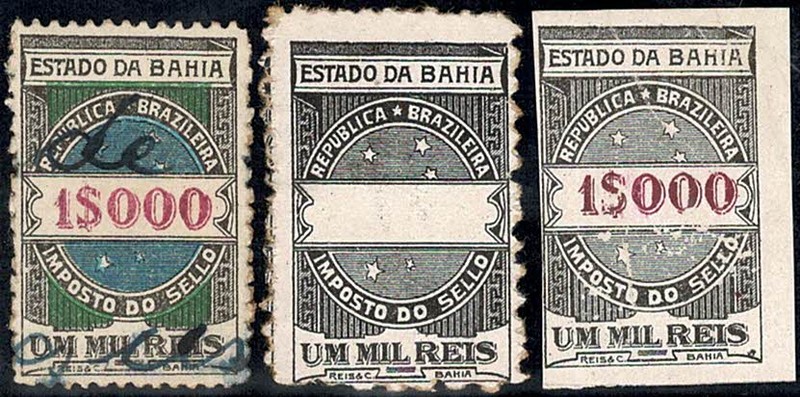 Bahia – (*) Imposto do Selo – 1$000 – 2 PROVAS , sendo uma picotada, sem facial e só com a impressão da cor preta e a outra, sem picote, com facial e só com a cor preta impressa (raspagem) Acompanha selo normal para comparativo.