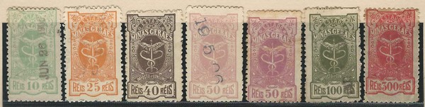 Minas Gerais – ◉/*/(*) Imposto de Consumo – Ano 1905 – FC 1, 3 ?, 4, 5 (2 cores diferentes e também papéis) 6 e 8 (gomado) Total 7 selos. Lote 0981 da nossa 70ª VSO, agora oferecido com 20% de desconto…