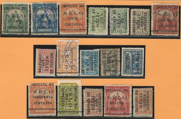 Minas Gerais – ◉/*/(*) Imposto do Selo – Ano 1943 – FC 56, 58/61, 63/67, 71 e 72 5 outros faciais que não constam no catálogo/estudo, incluindo o alto facial 30,00/30.000 – Total 17 selos diferentes. Lote 0985 da nossa 70ª VSO, agora oferecido com 20% de desconto..