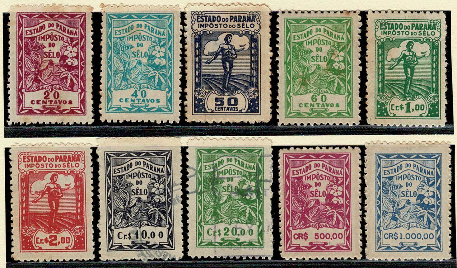 Paraná – */(*)/◉ Imposto do Sello – Ano 1945 – FC 67, 69, 70, 71, 72, 73, 75, 76 e 81 Facial de 1.000,00 que não consta no catálogo/estudo. Lote 1.020 da nossa 70ª VSO, agora oferecido com 20% de desconto..
