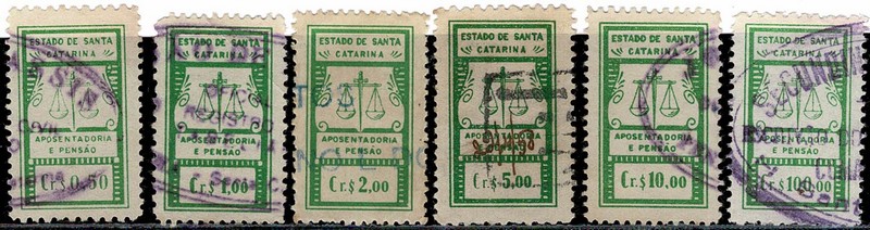 ◉ Santa Catarina – Aposentadoria e Pensão – Ano 1956 – 6 diferentes faciais: 0,50/1,00/2,00/5,00/10,00 e 100,00 – O 1º e o último não constam do estudo…….