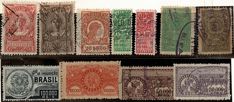 FEDERAL – Pequeno, mas seleto conjunto com 11 estampilhas diferentes entre faciais de 20$000 e 200$000: Thesouro Nacional (maioria, todos usados) Consumo (100$000 nova) e Imigração (100$000 nova).