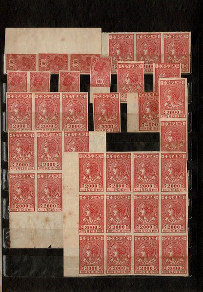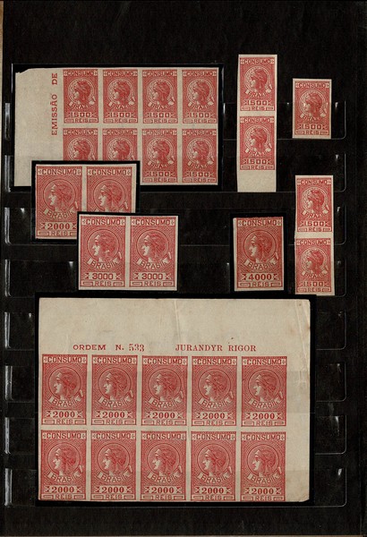 ACUMULAÇÕES – SÓ FEDERAL, SÓ CONSUMO e SÓ NA COR VERMELHA – Classificador contendo estoque com cerca de 550 itens, com e sem uso, quase todos em múltiplos ou blocos maiores. Engloba cerca de 3 séries, mas todas só do tipo mencionado: Federal, de consumo e na cor vermelha. Material bem limpo de um modo geral