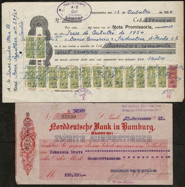 PERFURADOS – Conjunto com 5 Notas Promissórias, com selos fiscais. 3 delas com perfuração no valor devido, 1 com perfuração provavelmente quando foi paga e a outra com múltiplas perfurações “PAGO”. Anos 1908 a 1954