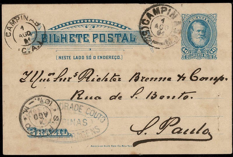 Ano 1891 – Bilhete Postal BP14 (40Rs) circulado de Campinas para São Paulo, com carimbo de chegada. Carimbo frontal: Campinas C.A.