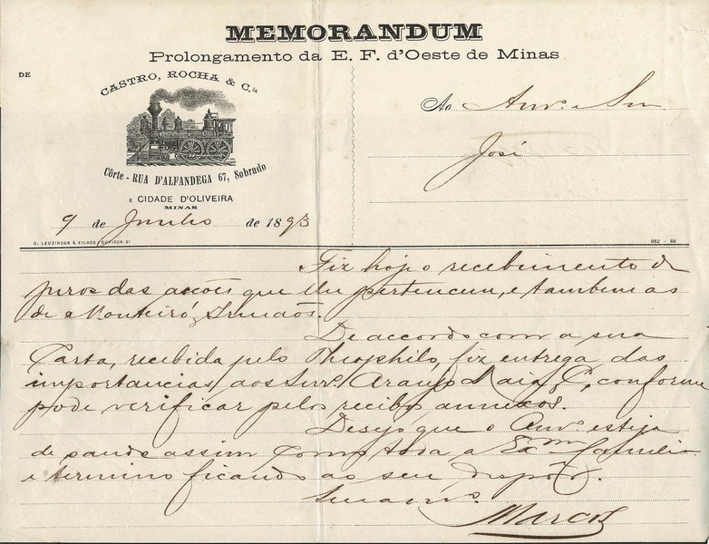 Ano 1893 – 2 Memorandos (Prolongamento da E.F. Oeste de Minas) timbrados da Empresa Castro Rocha e Cº, enviado da cidade de Oliveira (MG) para a mesma pessoa, mas sem indicação da cidade…..