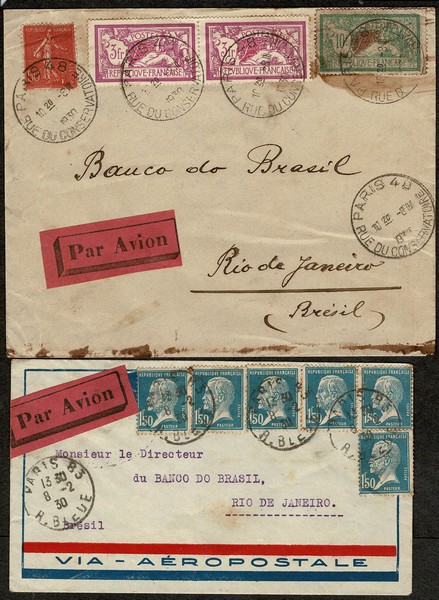 Aeropostale – Ano 1930 – 2 Envelopes aéreos Franceses, circulados para o Rio de Janeiro, com chegada. Datas: 22.2 e 16.3 – Uma delas com bela franquia múltipla do selo Pasteur e timbrado da empresa. Normal conservação