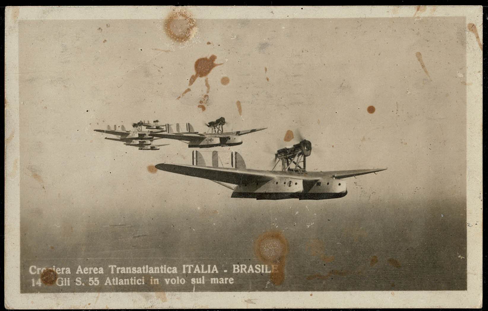 BALBO – Ano 1930 – Cartão Postal Italiano, circulado para a Bahia, com chegada e figurando esquadra nº 14 ? sobre o Atlântico e alusivo à ligação Itália/Brasil. Manchas de Bolor…