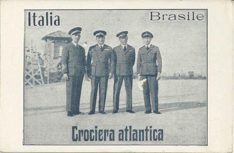 Balbo – Ano 1930 – Raro cartão postal Italiano, figurando tripulação do Aparelho n° 10 – Esquadrilha “Verde” e alusivo à “Crociera Aérea Transatlântica ITALIA-BRASILE” (Cruzeiro Aéreo Transatlântico Itália-Brasil) Peça ainda com “etiqueta” na cor da esquadrilha carimbo alusivo ao evento e também circulada internamente e seguindo os lotes acima, em qualidade européia, apenas com mínima raspagem num ponto da imagem (aviador).