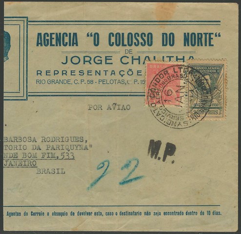 Condor – Ano 1930 – Envelope refilado no lado esquerdo, circulado do Rio Grande do Sul para o Rio de Janeiro, com chegada. Ambos carimbos alusivos. Selo vovó K11 (Victor Konder com data 16.1 – 1 semana após seu lançamento) Pontos de ferrugem e peça com vinco central.