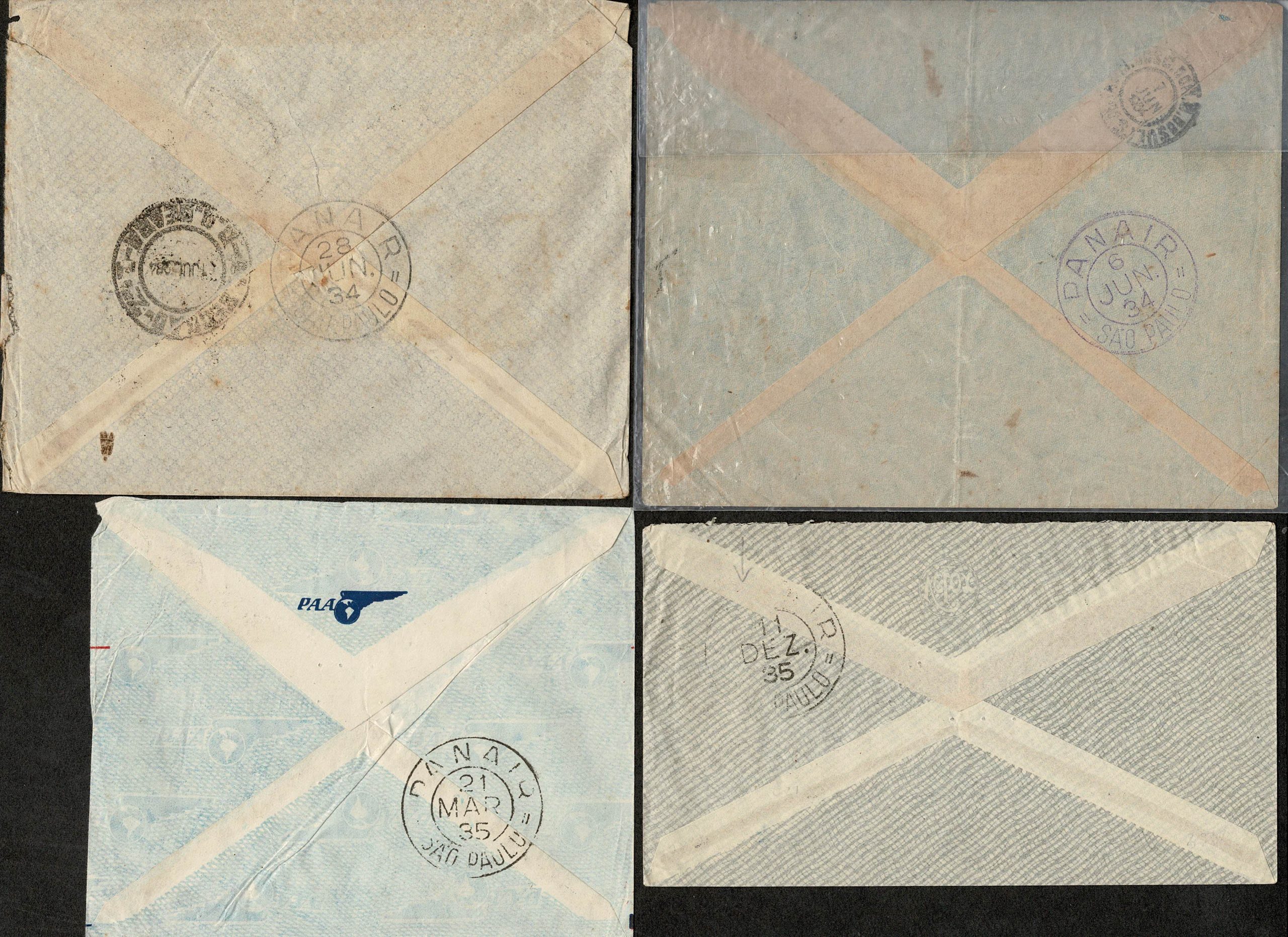 PANAIR/PAN-AMERICAN – CARIMBO CIRCULAR DA EMPRESA – Anos 1934/1935 – 4 envelopes circulados (2 internamente e 2 ao exterior) todos saindo de São Paulo e com o carimbo circular da empresa (vide imagem) aplicado sempre no verso, quando da saída – 3 em preto e 1 em violeta