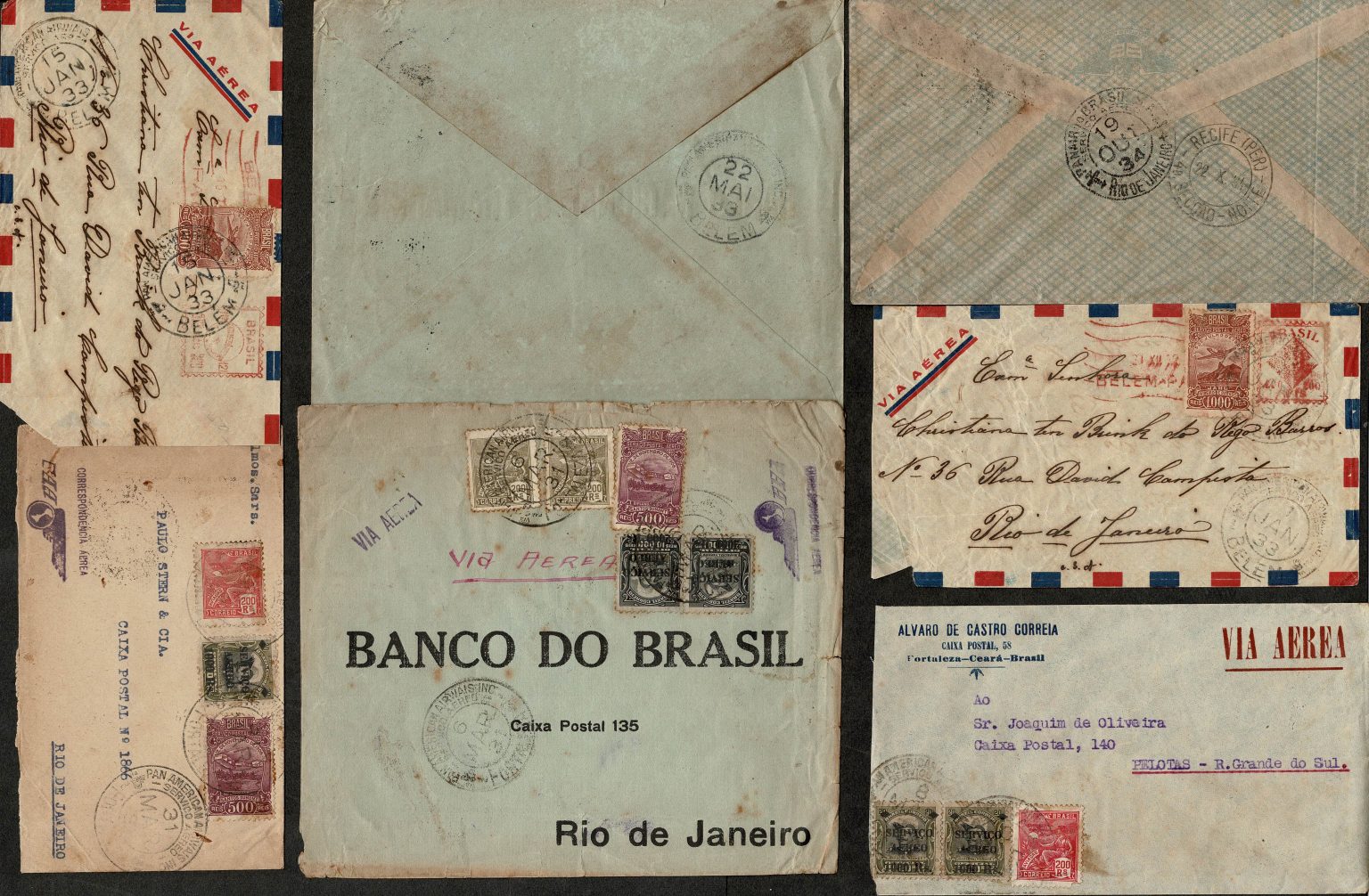 PANAIR/PAN-AMERICAN – CARIMBO CIRCULAR DA PAN AMERICAN – Anos 1931/1934 – 11 envelopes circulados, tendo como saída as cidades de: Belém x 3, Fortaleza x 6, Porto Alegre e Rio de Janeiro (este escrito Panair do Brasil) Parte como obliterador