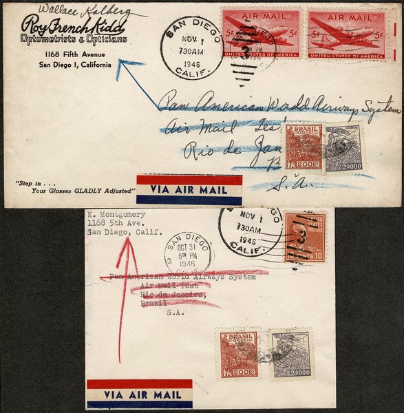 Panair – Ano 1946 – 2 envelopes vindo da cidade de São Diego (USA) para o Rio de Janeiro, com 2 selos Brasileiros frontais, para pagar o valor da taxa de devolução. No verso, carimbo de recepção da própria empresa. Voo de teste, da mala aérea interamericana para verificar o tempo gasto e a entrega. Bem limpos. Lote 1.167 da nossa 70ª VSO, agora oferecido com 20% de desconto.