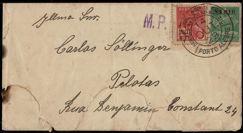 VARIG – Ano 1929 (14.10) Envelope circulado de Porto Alegre para Pelotas, com chegada. Selo vovó V2 com variedade na sobreestampa: R de Varig partido. Peça com alguns cortes na parte inferior/traseira. Pede-se verificar
