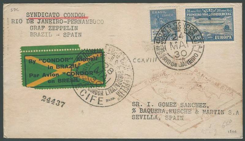 Zeppelin – Sieger 59C – Ano 1930 – Envelope registrado ?circulado do Rio de Janeiro, via Recife, para a Espanha, com todos os carimbos alusivos ao Vôo. Selo Z3 vovó. Peça lavada, provavelmente para tirar ferrugem – 320 UF= /- R$ 1.750. Vide lotes 5.573 e 5.574