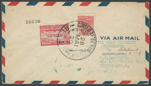 Zeppelin – Sieger 59E – Ano 1930 – Envelope circulado do Recife para os USA, com todos os carimbos alusivos ao Vôo. Selo Z8 selo vovó.
