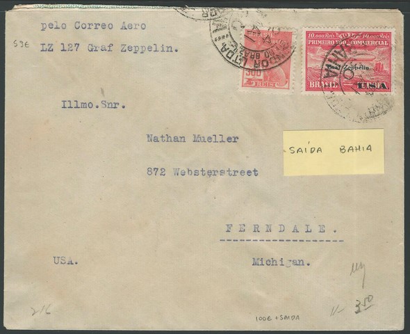 Zeppelin – Sieger 59E – Ano 1930 – Envelope circulado da Bahia, via Recife, para os USA, com carimbo do Vôo – Selo Z8 vovó – 370 UF = /- R$ 1.750