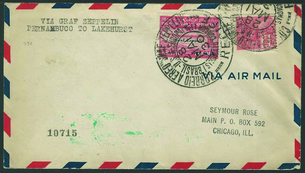 Zeppelin – Sieger 59E – Ano 1930 – Envelope circulado do Recife para os USA, com todos os carimbos alusivos ao Vôo. Selo Z8 selo vovó