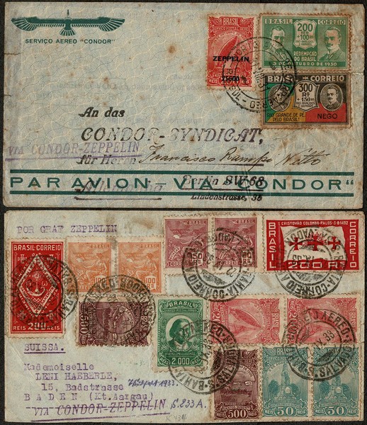 Anos 1931 e 1933 – Sieger 125A e Sieger 233A – Respectivamente. Ambos circulados para a Alemanha, com todos os carimbos alusivos aos Voos. O 1º circulado do Rio Grande com o carimbo do voo quase ilegível, com selo Z10 + 2 selos da Revolução de 30 e o segundo, de Salvador com 14 selos diversos entre regulares, aéreos e comemorativos. Ambos com pontos de ferrugem..